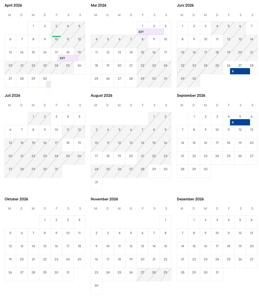 Die grauen Termine sind durch Eigennutzung oder Vermietung belegt.